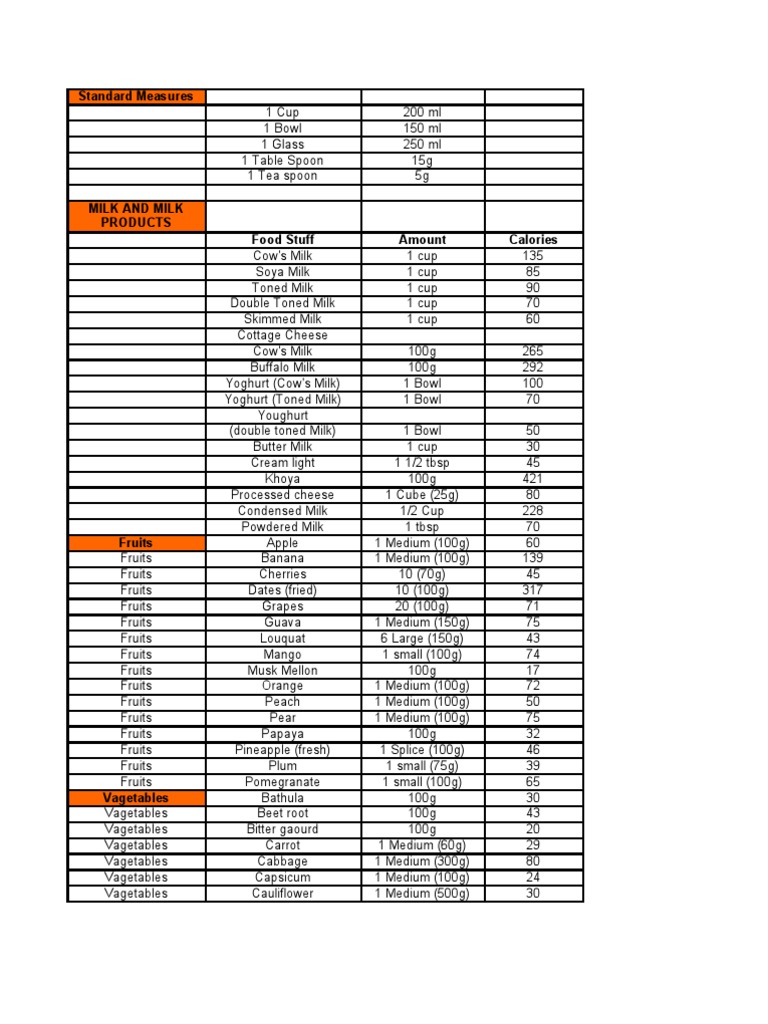 Calorie Chart For Indian Food Vegetable And Fruits
