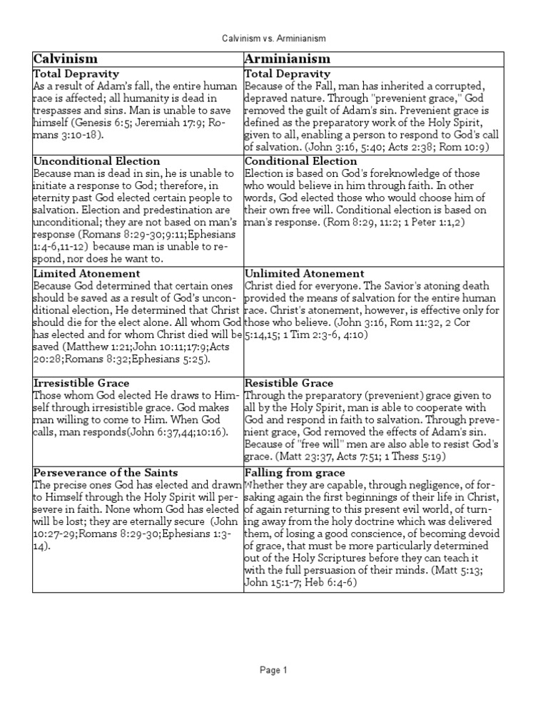 Calvinism Vs Arminianism Comparison Chart Arminianism Calvinism