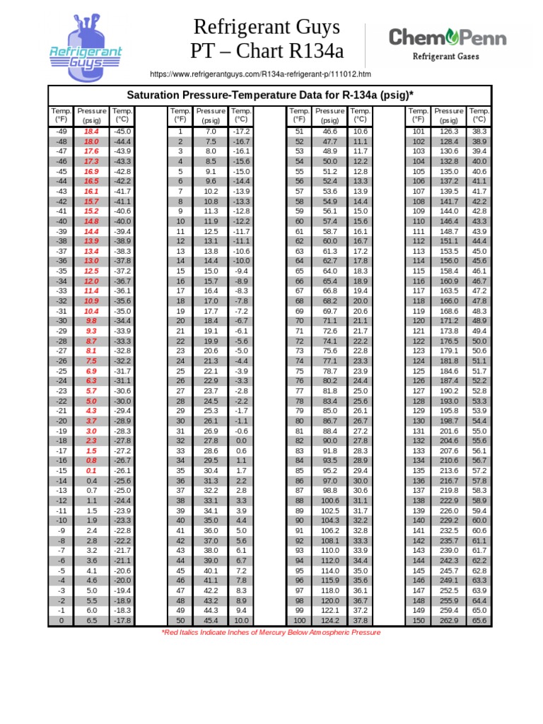 R 134a Refrigerant Pressure Temperature Chart Pt Table